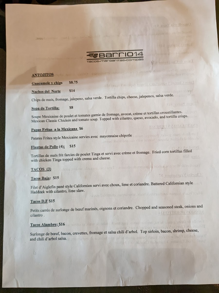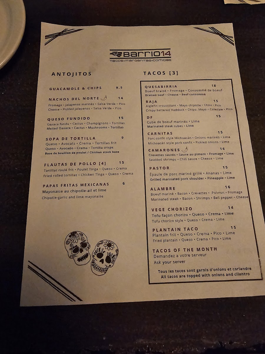Welcome to BARRIO14, a charming gem located at 3697 Boul. Saint-Jean in Dollard-des-Ormeaux. This family-owned establishment has quickly gained fame for its authentic Mexican cuisine and vibrant atmosphere. The menu features a delightful array of dishes, with standout items like perfectly seasoned tacos, rich guacamole, and enormous burritos that leave patrons craving more. Guests rave about the innovative range of margaritas, particularly the unique hibiscus flower variety, perfectly complementing the flavorful offerings.